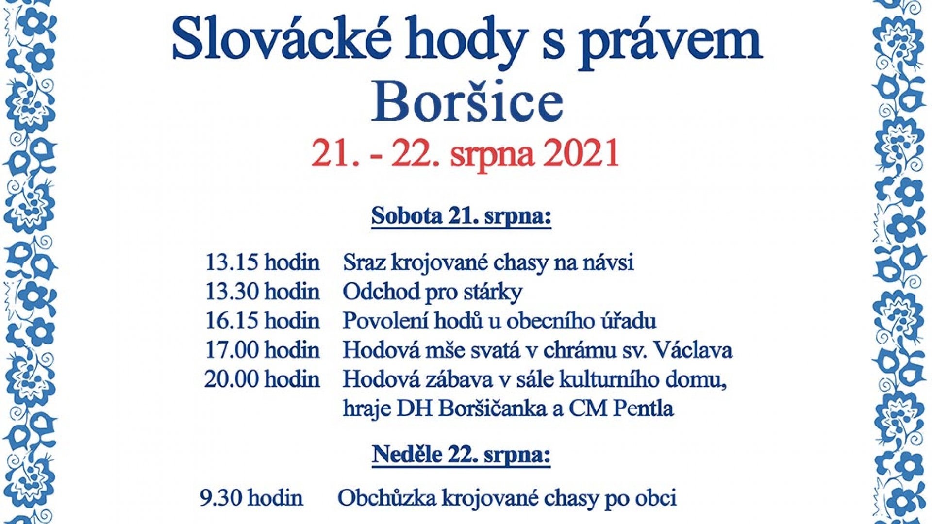 02.08.2021 Hody Boršice 2021 Z důvodu epidemie COVID-19 a obavy opětovného lockdownu po říjnových volbách, jsme se rozhodli přesunout Boršické hody na mimořádný termín 21.-22.8.2021. Věříme, že i přes mimořádný termín, si hody opět mimořádně užijete s námi! Galerie